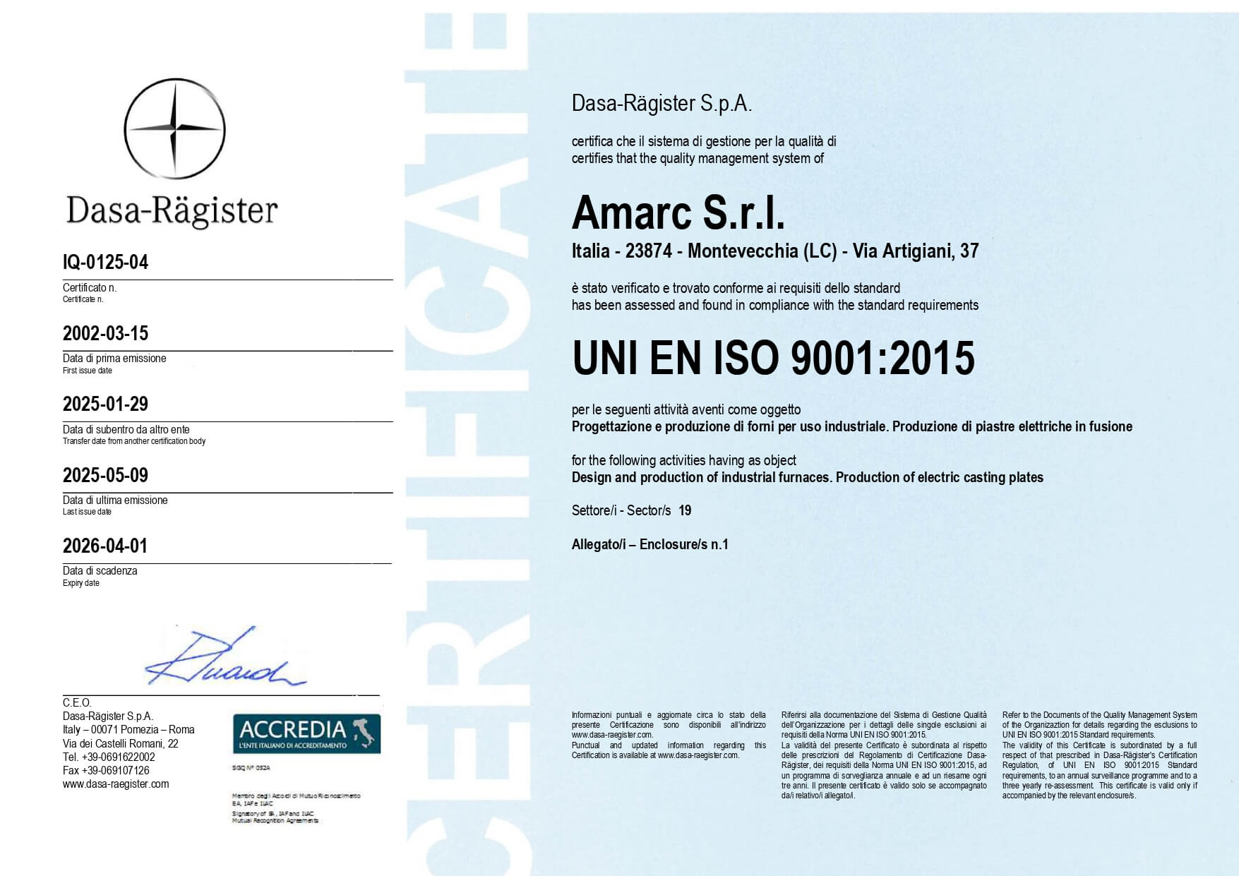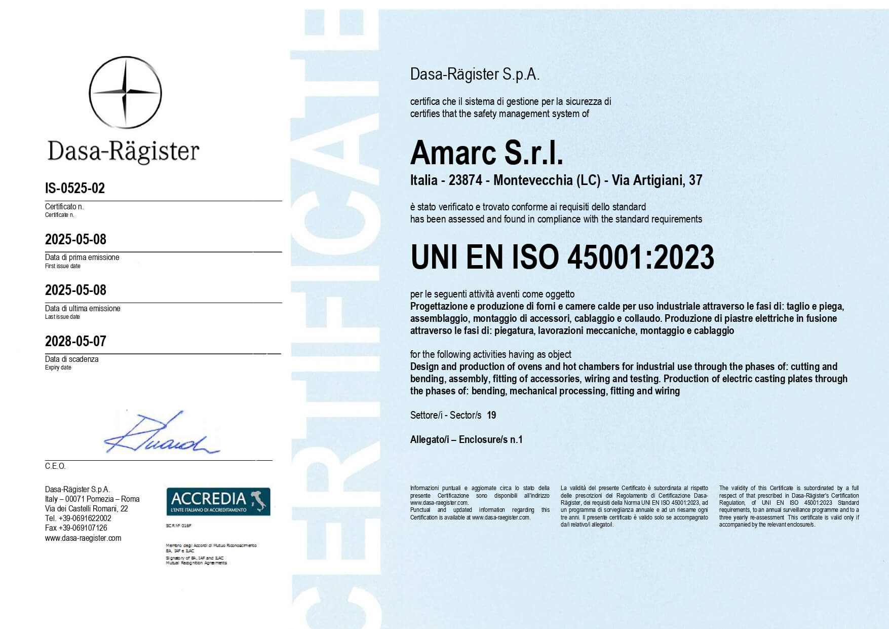 The company has long been ISO 9001:2015 certified for the design and production of industrial furnaces and hot chambers, as well as for the manufacturing of cast electric plates. In the course of 2025, it upgraded its system by obtaining ISO 14001:2015 certification for environmental management and ISO 45001:2023 for health and safety management.