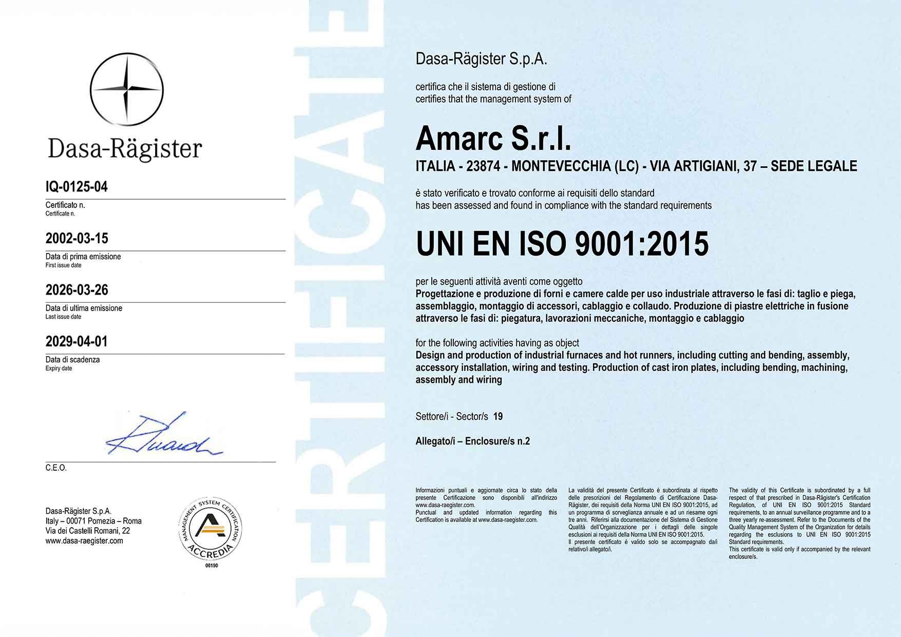 La empresa cuenta desde hace tiempo con la certificación ISO 9001:2015 para el diseño y la producción de hornos y cámaras calientes para uso industrial, así como para la fabricación de placas eléctricas fundidas. Durante el año 2025, ha mejorado su sistema obteniendo las certificaciones ISO 14001:2015 para la gestión ambiental y ISO 45001:2023 para la gestión de salud y seguridad.